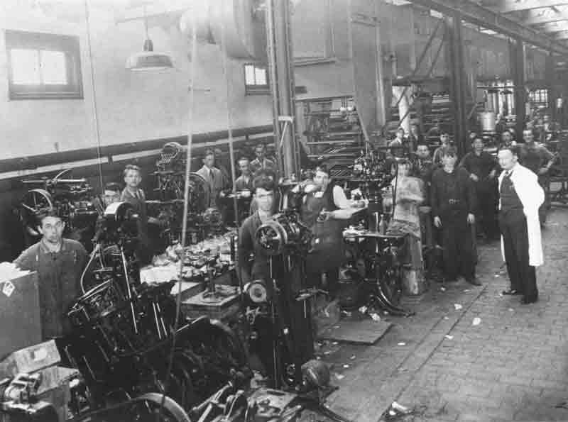 De onderwerkafdeling van de schoenfabriek Bloch & Stibbe. Geheel rechts in witte stofjas Leopold Guthmann (Collectie GAW, fotonr. 41229)