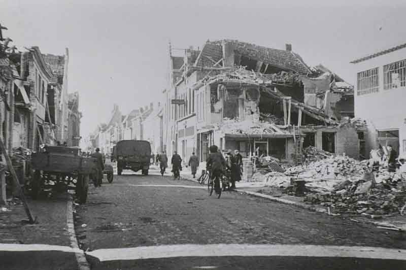 De ravage die door de ontploffing van een V1 werd aangericht op 10-02-1945. In het midden van de foto het postkantoor, Grotestraat 289, dat aan de achterzijde zwaar beschadigd was, door deze beschadigingen werd het postkantoor ondergebracht in het telefoonkantoor op de Winterdijk (foto: J. de Bont, Waalwijk/GAW, nr. 83760)