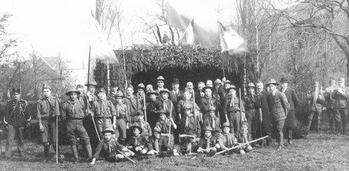 Prins Hendrik met de Waalwijkse padvinders, 6 april 1918. Voor de boog v.l.n.r. H. Wiesman, M. Fens (districtcommissaris padvinders), Z.K.H. prins Hendrik, burgemeester De Surmont de Bas Smeele, Philip Timmermans, J. van Iersel en E. Kleijberg (SALHA,...)