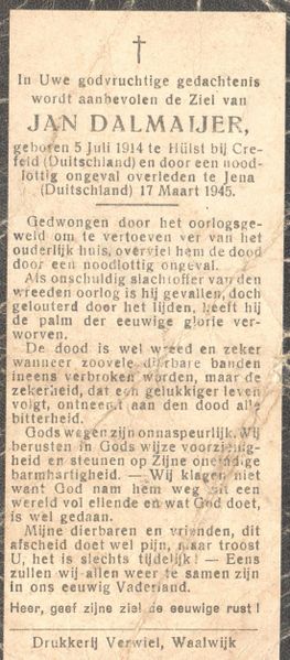 Bidprentje Johan (Jan) Dalmaijer (collectie Jan Dalmaijer, Waalwijk)