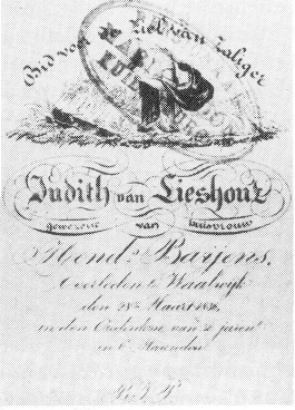 Bidprentje van Van Lieshouts jongste zus. Tekening en gecalligrafeerde letters zijn vrijwel zeker door hem ontworpen: een aan een graf geknield persoon, 1836 (Collectie R. Zijlmans, Waalwijk). Illustratie: De Klopkei (21e jaargang, 4e kwartaal 1997)