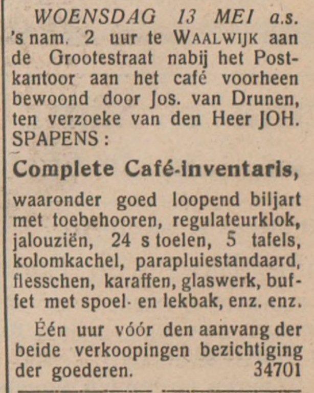 Advertentie uit de Echo van het Zuiden d.d. 9 mei 1925 met aankondiging van de openbare verkoop van de inventaris van cafe de Zwarte Ruiter.