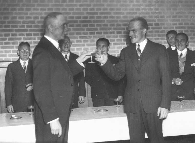 Tijdens de huldiging op het gemeentehuis heft werelduurrecordhouder Frans Slaats het glas met burgemeester Moonen (Collectie SALHA/GAW, fotonr. 40687)