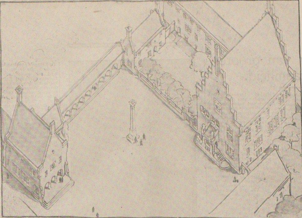 Situatieschets van het oorspronkelijke idee van Kropholler: een marktgebouw met arcaden (Uit De Echo van het Zuiden d.d. 29 juli 1933)