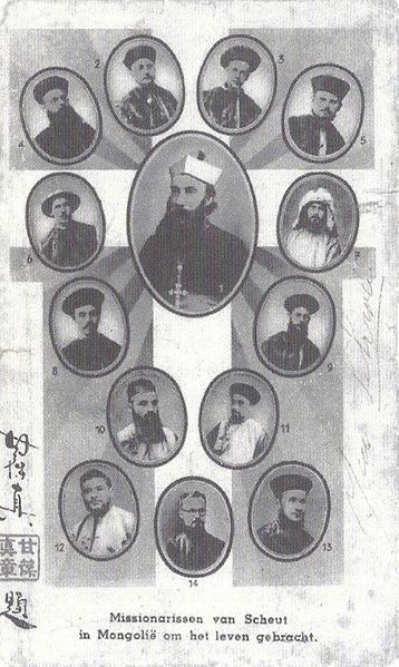 Bidprentje voor de 14 paters die in 1900-1901 omkwamen in Mongolië. Linksboven Andreas Zijlmans, in het midden bisschop Hamer (collectie Jan de Haan)