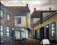 Links de woning van de familie Pol, in het midden de ‘kleine poort.’ Schilderij van J. Klerx, foto Ad van Liempt