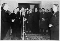 Tijdens de huldiging in het gemeentehuis na het behalen van zijn Europese biljarttitel wordt Kees de Ruijter toegesproken door burgemeester Lambooy, februari 1950 (Collectie SALHA, fotonr.11674, foto Fotopersbureau Het Zuiden).