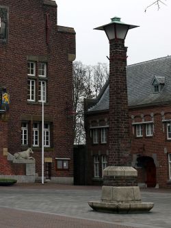 Midden op het plein staat als symbool tussen burger en overheid een smeedijzeren lichtzuil. Het licht van deze lantaarn is, naast het praktische verlichten van het plein bij duisternis, enerzijds symbool voor de overheid die in het raadhuis zetelt en zijn wijsheid in de vorm van goede besluiten en dienstbaarheid over die bevolking heen uitstraalt. Anderzijds is het een lichtend baken voor de burger die hem zegt: Hier moet ik zijn, op mijn overheid kan ik vertrouwen. Het plein is mede door dit symbool ook echt een ontmoetingsplaats voor burger en overheid. Om de werking van het symbool optimaal in beeld te brengen is (…) het plaveisel van het plein geheel gericht naar de lantaarn en het perkje midden op het plein. Door deze harmonie wordt niet alleen de lantaarn in zijn rol van symbool versterkt, maar ook de architectuur van het raadhuis zelf wordt er extra door benadrukt. |