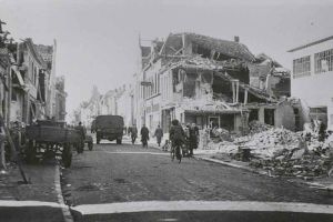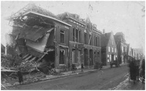 In het midden het zwaarbeschadigde postkantoor (foto: J. de Bont, Waalwijk/GAW, nr. 83760).