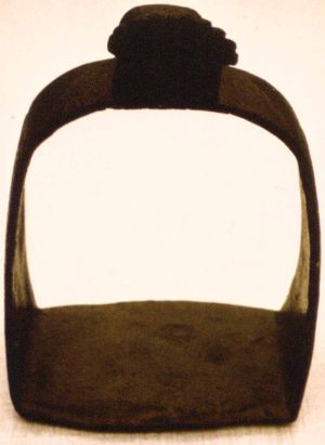 [[Bestand:43844 stijgbeugel.jpg|rechts | [[Bestand:43844 stijgbeugel.jpg|rechts|thumb|De stijgbeugel (hoog 157 mm breed 110 mm voetvlak 103 x 75 mm) is aan de zijkanten versierd met zeven verticale strepen, boven ingesloten met twee horizontale bandjes. Daarboven twee schuin oplopende bandjes en aan de bovenkant is een schelp uitgesmeed (Foto Sjef Vugts). ]] | ||