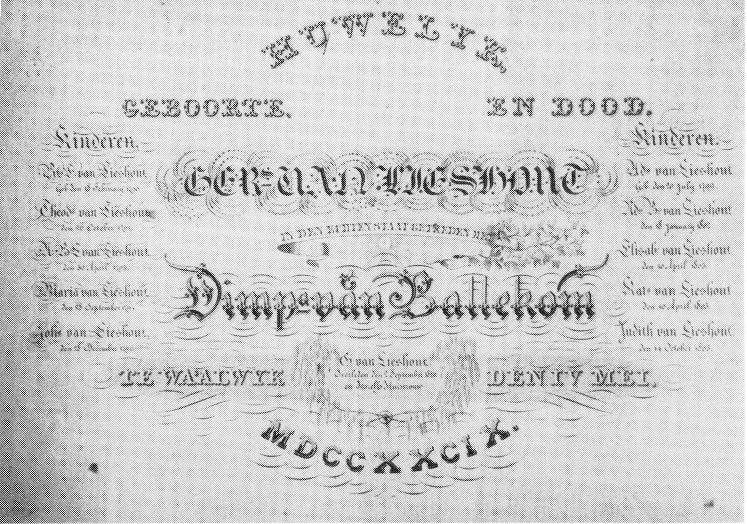 | 3 jun 2024 12:27 | Gecalligrafeerd gezinsoverzicht A.B. van Lieshout ca 1850.jpg (bestand) | 328 kB | Gecalligrafeerd gezinsoverzicht "Geboorte, huwelijk, en dood Gers. van Lieshout in den echten staat getreden met Dimpa van Ballekom", ca. 1850 (Brabant-collectie Bibliotheek UvT Tilburg). Illustratie: De Klopkei (21e jaargang, 4e kwartaal 1997) | 1 | |